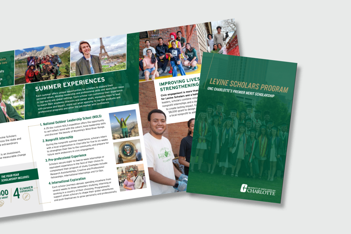 The Levine Scholars Program is Charlotte's premier merit scholarship program that covers full tuition, housing, meals, and books for four years. It also provides funding for four summer experiences and access to a civic engagement grant.