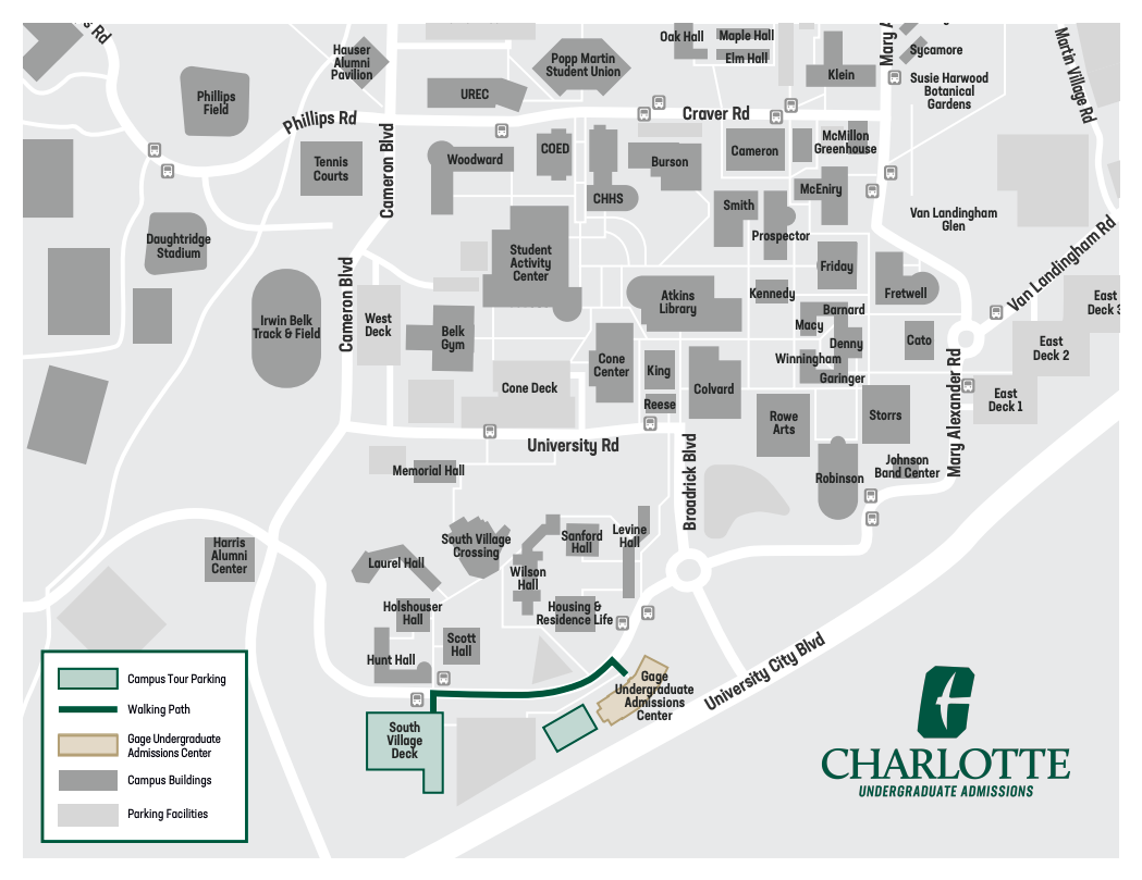 When the Admissions Lot is full, please park in the South Village Deck (1st floor). Follow the green path for a 3-5 minute walk from the South Village Deck to the Gage Undergraduate Admissions Center.